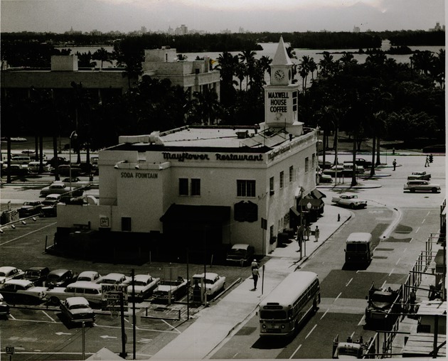 Looking East from S. E. Second Avenue. Todays' One Biscayne Tower stands where the Mayflower Restaurant stood. At the top of the photograph is Dodge Island, the site of the future port of Miami and Bayfront Park with the Main Library standing at its western edge.