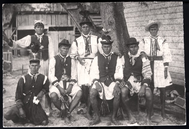 Group of Seminole men wearing long shirts and bowler hats. From left: Willie Willie, ?, ?, Sam Willie, Frank Willie, ?, ?