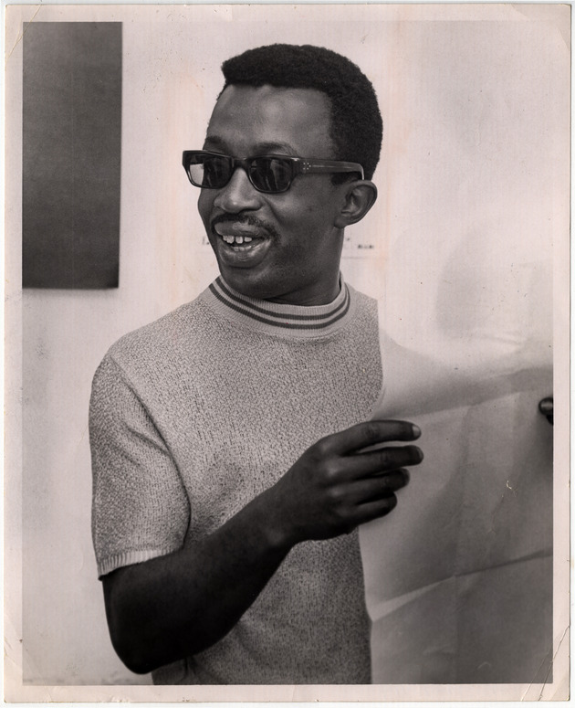Civil rights activist Bernard "Bernie" Dyer, wearing sunglasses and with paper in hand.