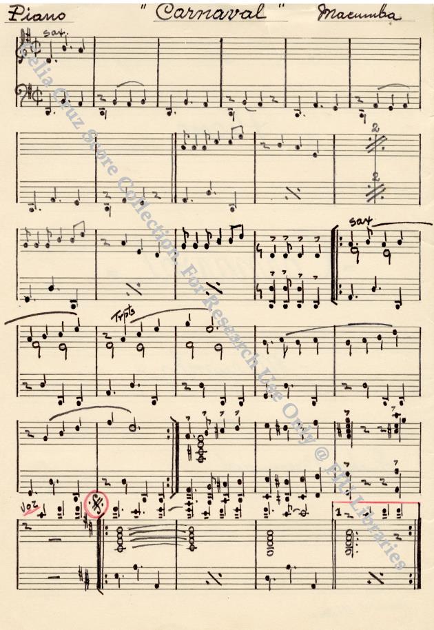 Incluye partes para: contrabajo, piano, saxofon alto 1, saxofon alto 3, saxofon tenor 2, saxofon tenor 4, saxofon baritono 5, trombon 1, trombon 2, trompeta 1, trompeta 2 y trompeta 3.