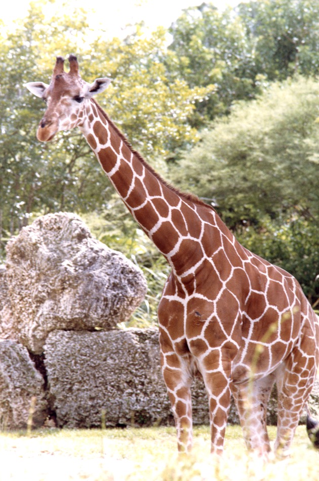 Reticulated giraffe standing in its habitat at Miami Metrozoo