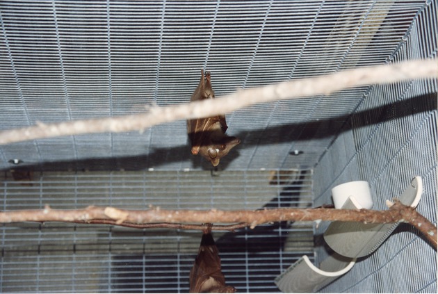 Gambian epaulette fruit bat in shadow hanging from the top of its cage at Miami Metrozoo