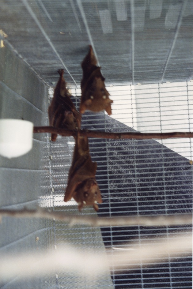 Three Gambian epaulette fruit bats hanging on their cage and a branch at Miami Metrozoo