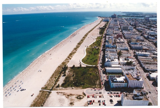 Aerial photograph of South Beach, Ocean Drive and Miami Beach Convention Center.