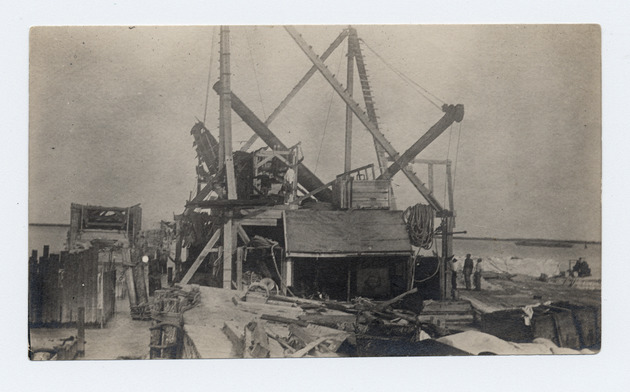 Workers outside one of the dredge/pile drivers used in building the railroad. A gift of Mrs. Nora Smiley.
